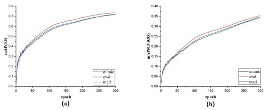 The channel-wise knowledge distillation (cwd) method was employed in this study for the purpose of distillation. In order to conduct a comparative analysis of the efficacy of various knowledge distillation techniques, the YOLOv5s model was subjected to distillation using three distinct methods: mgd [68], mimic [69], and cwd. These methods were applied within a consistent experimental framework. The experimental results are depicted in Figure 9. The figure illustrates that the other knowledge distillation methods, namely mimic and mgd, exhibited a comparable training accuracy. However, the cwd method demonstrated a superior training accuracy and exhibited faster improvement.