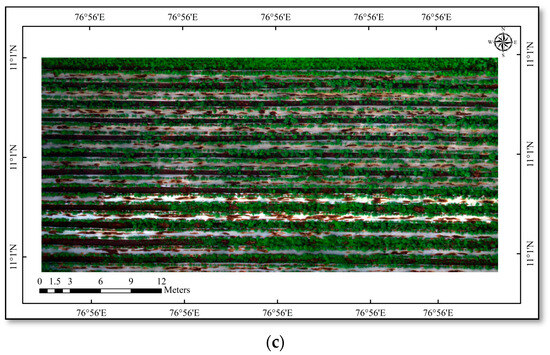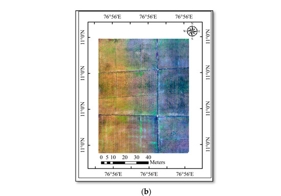 A flight mission was carried out between 11 AM and 12 PM under a clear sky to collect multispectral images (Figure 2b,c and Figure 3a,b). A ground reference point was used for the georeferencing process (GCP). The image is captured by the camera, stored in the memory, and transmitted via telemetry to the ground station. A calibrated reflectance panel (CRP) was also used to calibrate the MicaSense RedEdge. Before each flight, the calibration was immediately performed as per the calibration manual.