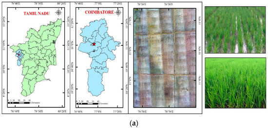 (a) Study area—rice; (b) drone-derived orthomosaic image of rice field.