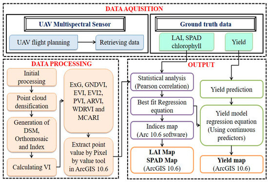 By combining the physiological characteristics of the plant with vegetative indices, the crop yield forecast can be performed. Yield estimation might be conducted quickly by combining these models and spectral data. In addition, they can facilitate a better understanding of the differences in vegetative development and yield potential [9]. UAVs are widely employed to estimate yields and monitor vegetation growth. However, the lack of technologies for systematically tracking crop growth is one of the main impediments to improving agricultural production and quality [10]. Crop biomass, nitrogen status, and yield prediction have been the primary areas of recent research. Crop condition assessment and real-time canopy monitoring can help develop precise management strategies to increase yields. Crop yield predictions using remote sensing data have expanded the possibilities for monitoring and analyzing crop yields.