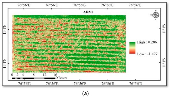 LAI and chlorophyll were calculated using high-resolution multispectral images, and the results showed strong correlations between both positive and negative outcomes. The study area generated different vegetation indices maps, viz., ARVI, MCARI, WDRVI, NGRDI, ExG, RGBVI, and VARI (Figure 4 and Figure 5). The mean vegetation indices of different indices and ground truth data collected are given in Table 4 and Table 5. The vegetation indices generated different map outputs because each index uses a different set of wavebands. These indices can therefore be used to identify variations in the LAI and chlorophyll content of the crops. Ten points were chosen from the index map using the ground truth data coordinates in ArcGIS 10.6, and the extracted point values were used in the pixel-by-value tool.
