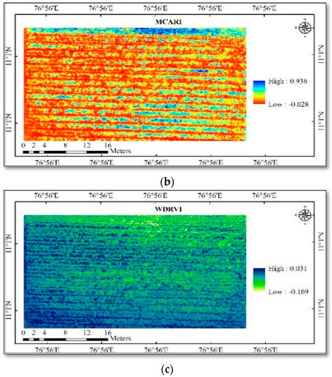 (a) Spatial variability of vegetation indices in cotton—ARVI; (b) spatial variability of vegetation indices in cotton—MCARI; (c) spatial variability of vegetation indices in cotton—WDRVI.
