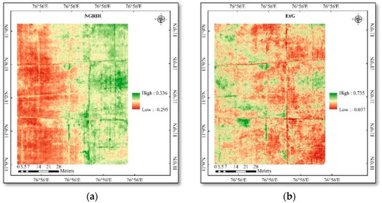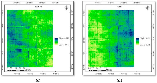 (a) Spatial variability of vegetation indices in rice—NGRDI; (b) spatial variability of vegetation indices in rice—ExG; (c) spatial variability of vegetation indices in rice—RGBVI; (d) spatial variability of vegetation indices in rice—VARI.