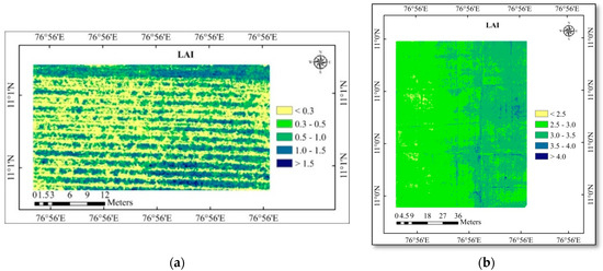 (a) LAI map of the cotton study area; (b) LAI map of the rice study area.