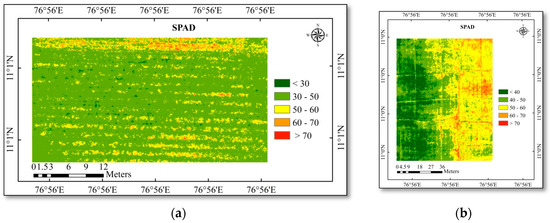 (a) SPAD chlorophyll map of the cotton study area; (b) SPAD chlorophyll map of the rice study area.