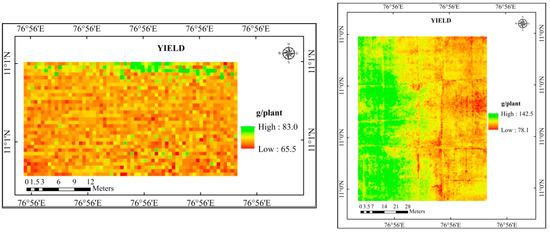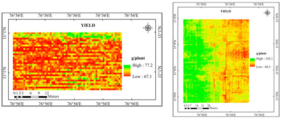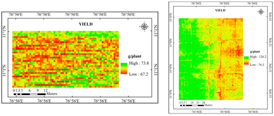 The yield map for the study area was created using the yield equation model, which recorded a higher R2 value. The yield map developed based on LAI (Figure 8), SPAD chlorophyll (Figure 9), and a combination of LAI and SPAD chlorophyll (Figure 10) was given.
