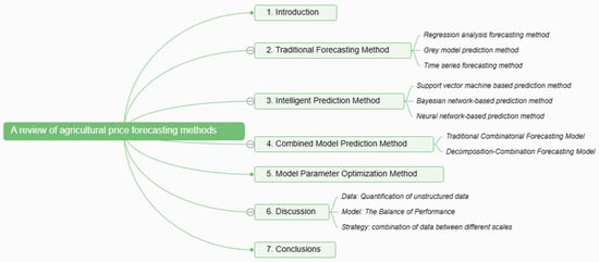 This paper describes the development of agricultural product price forecasting methods from single model to combination model, from traditional forecasting methods to intelligent forecasting methods. An introduction of the advantages and disadvantages of different methods with specific examples is presented and the future development trend of agricultural product price prediction methods is discussed. This paper analyzes and discusses the development status of agricultural price forecasting methods on the basis of reviewing the history of the development of this field. It summarizes the current problems and challenges faced by agricultural price forecasting methods, with a view to providing certain help and guidance for the development of the field of agricultural price forecasting. Figure 1 shows the structure of this paper.