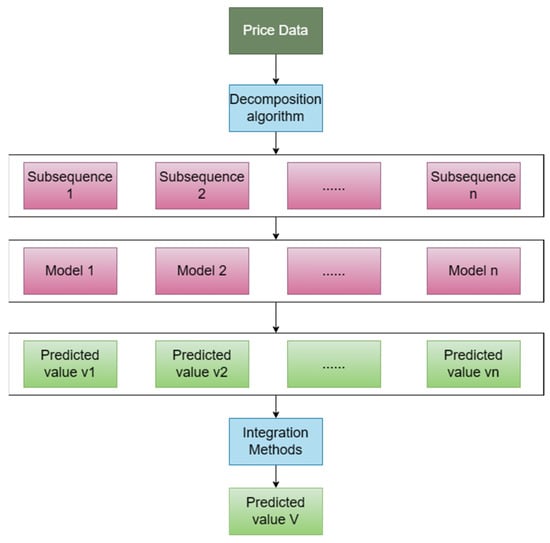 The “decomposition-ensemble” forecasting method is based on the multi-scale decomposition of original complex time series data. It dissects the fluctuation patterns and trend regularities of intricate systems at various scales. By understanding the inherent operational patterns of the system, predictive research is conducted, leading to a significant enhancement in forecasting performance. The decomposed ensemble combination model refers to splitting the intricate price sequence into several simpler sub-sequences. Each sub-sequence is individually forecasted using models, and the predictions of these sub-sequences are then integrated to obtain the forecasted values of the original sequence (Figure 3). The core of this methodology lies in selecting effective data decomposition tools. Common decomposition methods include seasonal decomposition [48], wavelet decomposition [49], empirical mode decomposition [50], and variational mode decomposition [51]. The advantages of the “decomposition-ensemble” combination forecasting model lie in its ability to leverage information across different scales. It mitigates the impact of features like noise, trends, and cycles inherent in complex data, thus enhancing prediction accuracy and robustness. However, a drawback of the “decomposition-ensemble” combination forecasting model is the need to determine suitable data decomposition tools and integration methods; otherwise, it could affect the extraction and reconstruction of data features. Table 4 summarizes the commonly used decomposition methods.