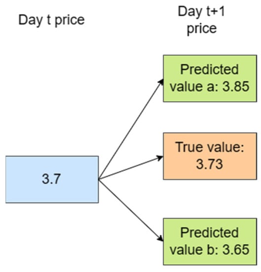 - Balancing Accuracy of Predicted Values and Predicted Trends. When evaluating the quality of forecast results, it is often assessed from two perspectives: predicted values and the forecasted trend (or rise and fall). For instance, for a certain agricultural commodity, the price on day t is 3.7, and the actual price on day t + 1 is 3.73. Predicted value a is 3.85, while predicted value b is 3.65. From an error perspective, predicted value b is closer to the true value than predicted value a. However, considering the forecasted trend, predicted value a is accurate, while predicted value b is opposite (Figure 5). Achieving precise predicted values and accurate forecasted trends does not necessarily conflict, but simultaneously achieving both can be challenging. In future research, ensuring the accuracy of both predicted values and forecast directions is a key issue to address. Moreover, the accuracy of the forecasted trend direction should be considered as a performance metric for future forecasting models, and methods like directional symmetry can be employed to measure the accuracy of the model’s forecast direction.