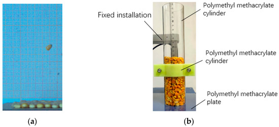 In the plane collision test, the particle plate made in advance was placed on the table, and a corn seed was selected to fall freely from a certain height. The high-speed camera was used to shoot the falling process of the corn seed and record the maximum height of the corn seed after the first collision (Figure 2a). The lifting method was used to measure the repose angle of corn seeds, and the test device is shown in Figure 2b. Place the bottomless PMMA cylinder on the horizontally fixed PMMA bottom plate, select six hundred corn seeds into the cylinder, and lift the PMMA cylinder at a speed of 0.04 m·s−1.