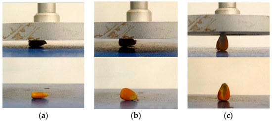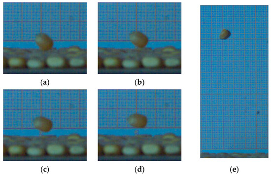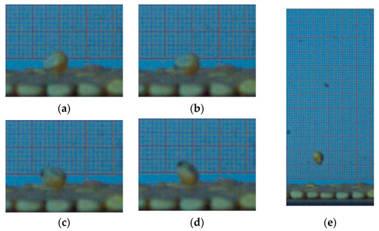When measuring the corn–corn collision recovery coefficient, multi-point collision will occur between corn seeds due to the influence of the irregular surface of corn seeds and the angle of the collision of corn seeds. Figure 10 shows the process of single-point collision of corn seeds. Corn seeds bounce immediately after the collision (Figure 10a).