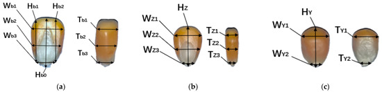 Characteristic dimensions definition diagram of corn seed: (a) flat; (b) quasi-conical; (c) quasi-cylindrical.