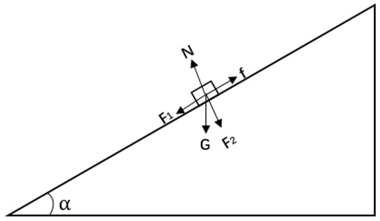 The static friction coefficient is measured using the inclined plane sliding method [24,25], and the measurement principle is shown in Figure 5. Place the corn seed on a test plate in a horizontal position, slowly increase the angle between the test plate and the horizontal plane and record the angle when the corn seed appears to slide. When the corn seed first appears to slide, the force balance equation on the test plate is as follows: