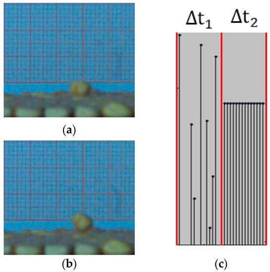 Figure 13 shows the high-speed photographic images of the multi-point collision of corn seeds and the waveform of the collision sound. Figure 13a,b are two collisions of corn seeds, corresponding to the sound waveforms in Figure 13d’s two-time intervals of and respectively. Figure 13c shows the rebound of corn seed after the second collision, corresponding to the sound waveform in the in Figure 13d.