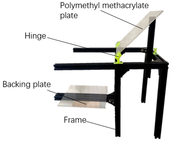 According to the above principle, corn seeds’ collision recovery coefficient was determined using a contact parameter measuring device (The test device is shown in Figure 15). The material of the test plate and the backing plate was PMMA. The angle between the PMMA plate and the horizontal plane is fixed at 45°, the backing plate is fixed at the lower part of the frame, and the corn seed falling point height is 5 cm from the test plate. Replace the test plate with a prepared particle plate when measuring the corn–corn collision recovery coefficient.