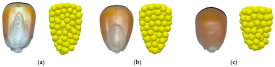According to the classification of corn seeds in Section 3.1.3 and the measurement results of characteristic dimensions of these three types of corn seeds, the 3D model was established. The method of particle aggregate was used for modeling in EDEM2018 (Figure 16), and the Hertz–Mindlin with Bonding model was used for the contact model [27,28,29].