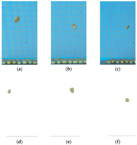 Plane collision test: (a) physical test of flat corn seed; (b) physical test of quasi-conical corn seed; (c) physical test of quasi-cylindrical corn seed; (d) simulation test of flat corn seed; (e) simulation test of quasi-conical corn seed; (f) simulation test of quasi-cylindrical corn seed.
