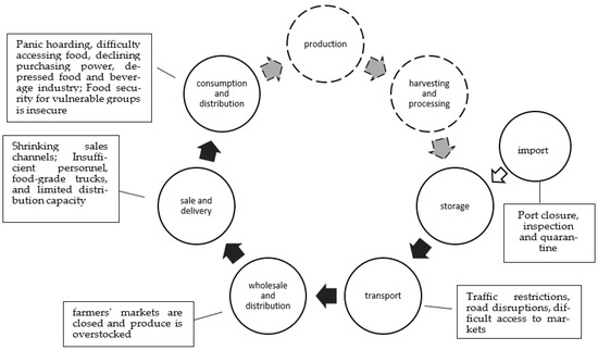 At the stages of transportation and distribution, travel restrictions, lockdowns and strict stay-at-home policies disrupted the food transportation and distribution system [77,78]. In many cities, there is a serious shortage of food trucks, loading and unloading trucks and drivers, and cities’ food supply has been disrupted and even interrupted for a time as a series of chaos emerged such as garbage trucks transporting food in Wuhan and raised a surge of negative public opinion [79]. Road restrictions and street blockades between urban and rural areas or between different cities have led to longer food supply chains, reduced varieties of food on the market, food spoilage and wastes, contamination and depletion of food in the distribution process [80]. Fresh vegetables, fruits and other perishable foods that are hard to store for long or have strict transportation conditions encountered quality issues such as short shelf life, poor quality of goods on the shelf, and food waste due to the longer transportation time [81,82]. The lack of healthy young and middle-aged people in the family, coupled with factors such as the suspension of dine-in or even the suspension of takeaway, and the insufficient number of logistics and distribution personnel have led to difficulties in food procurement and food insecurity for the elderly living alone, the disabled, and many other vulnerable people in cities [83]. Awareness and demand for hygienic, healthy and nutritious food consumption among consumers have increased dramatically [84], and orders with the “community-supported agriculture” mode in many developed and emerging countries have surged [85]. However, due to limited supply, insufficient number of employees and obstacles in logistics and distribution during the epidemic, it is difficult for the “community-supported agriculture” mode to meet the surging needs of customers [86]. Due to the fear of infection by takeaway merchants and delivery workers, hospitals and personnel from other front-line departments such as volunteer service stations in the fight against the COVID-19 have experienced insufficient and unstable food supply temporally at the initial chaotic stage of the epidemic.