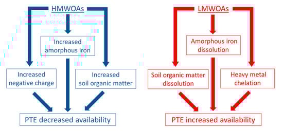 Organic acids and their effects on potentially toxic element availability (information obtained from Yao et al. [57]). HMWOA: high molecular weight organic acid; LMWOA: low molecular weight organic acid. Bold arrows indicate the effects of processes induced by LMWOAs and HMWOAs.