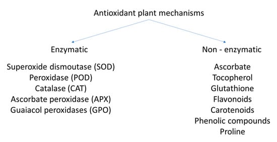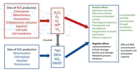 However, ROS are continuously produced in unstressed cells as by-products of plant cell metabolic functions (e.g., photorespiration in peroxisomes, redox reactions in cytoplasm, respiration in mitochondria and photosynthesis in chloroplasts) and their levels are controlled by a series of antioxidant enzymes and organic compounds. Exposure to biotic and abiotic stresses increase production of reactive oxygen (ROS) and reactive nitrogen species (RNS) is noticed through enzymic and non-enzymic reactions (Figure 3). When an imbalance between produced and scavenged ROS (in favor of the produced ROS) occurs due to stress factors, increased ROS concentrations can severely affect enzyme functionality, alter protein and membrane structure, and disturb gene expression [7,9,11,69,99,100]. Reactive oxygen species can be generated from oxygen molecules activated from sufficient energy (1O2), or through reduction reactions that result in the formation of hydrogen peroxide (H2O2), superoxide radicals (O2●−), and hydroxyl radicals (●OH) [101]. Reactive oxygen species can be categorized as free radicals that bear a non-conjugated electron in their external orbit (superoxide anion (O2●−), hydroperoxyl radical (HO2●), alkoxy radical (RO●) or hydroxyl radical (●OH)) and as non-radical molecules where orbital electrons are in pairs (singlet oxygen (1O2) and hydrogen peroxide (H2O2)) [9].