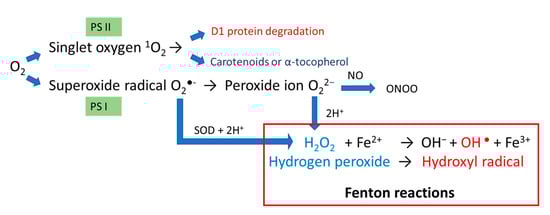 ROS production results in high oxidation rates for the residues cysteine (Cys), methionine (Met), lysine, arginine, proline, histidine, threonine, and tyrosine. Especially the aminoacids cysteine and Met that bear sulfuric groups are highly susceptible to ROS oxidation. Keeping O2●− and H2O2 concentrations at non-toxic levels is of paramount importance for plant cell homeostasis. When O2●−, H2O2 and Fe or Cu ions are present, Fenton reactions occur in plant cells leading to the production of hydroxyl radicals (O2●− → H2O2→ H2O2 + M(n−1) → OH− + OH● + M(n)) that are described as the most toxic reactive oxygen species. Essentially, hydroxyl radicals can react with almost every known biomolecule leading to their oxidation [7,11,85,107]. The ROS production and their effects on cells are presented in Figure 5.