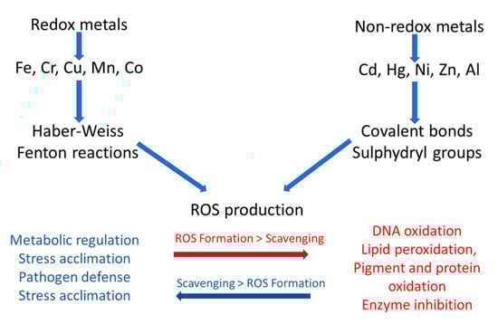 - Elements such as Pb, Cd, As, Hg, Ni, Al, Mn and Zn lead to the production of ROS by being attached to the active sites of enzymes (due to their high chemical affinity to SH groups) or by activating the NADPH oxidases [11,76].