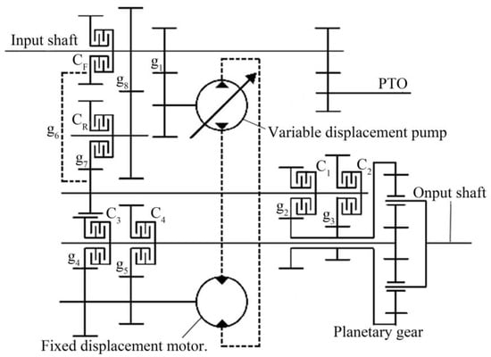 Transmission scheme of hydrostatic power-split CVT. Note: the symbol g represents the gear pair, and the symbol C represents the wet clutch.