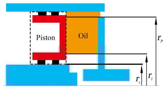 where ρ is the bulk density of the hydraulic oil, kg·m3; ω is the angular velocity, r/min; rp and rl are the outside radius and inside radius of the fluid volume acting on the piston, respectively, mm; and rr is the inside radius of the piston, mm.