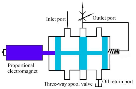 A proportional pressure valve is used to control the working pressure of the clutch, consisting of a proportional electromagnet and a three-way spool valve, as shown in Figure 4. When the electromagnetic force increases, the valve spool moves to the right to increase the opening of the outlet port, causing the output pressure to increase. When the electromagnetic force decreases, the valve spool moves to the left, causing the output pressure to decrease. On this basis, when the output pressure increases, the valve spool moves left to allow excess oil to flow back to the tank through the oil return port, thereby reducing the output pressure. When the output pressure decreases, the piston moves right to increase the output pressure. According to its working principle, the force equation of the valve spool is expressed as: