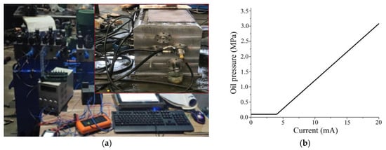 According to the above analysis, the output pressure of the proportional valve depends on the electromagnetic force Fg, which is controlled by a current signal. To clarify the corresponding relationship between the input current and output pressure, a signal generator is used to calibrate the valve, and the results are shown in Figure 5. It can be seen that within the current range of 4–20 mA, the input current of the proportional valve exhibits a clear linear relationship with oil pressure. Therefore, we used the calibration data to construct an electromagnetic model of the valve.