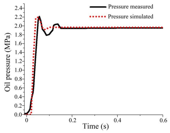 The hydraulic circuit constructed based on clutches and proportional valves is the core of the power-shift system and requires independent experimental verification of its mathematical model. We closed the outlet of the proportional valve before the experiment, and the PLC controlled its AD module to output a step signal corresponding to the rated pressure of the clutch. Note that the output signal of the AD module used was the voltage, which needed to be converted into a 4–20 mA current through a converter module to control the proportional valve. At the same time, the Labview program controlled the data acquisition card (NI USB-6009) to capture the output pressure of the proportional valve feedback from the sensor. The input signal of the simulation model was consistent with the experiment, that is, the input current was modulated from 0 to the maximum value in the experiment in a very short time to observe the pressure response of the model. The simulation and measurement results of the step response of the proportional pressure valve are shown in Figure 6. From the figure, it can be seen that the simulation results of the mathematical model constructed in this study were highly consistent with the experimental results and could meet the needs of subsequent dynamic analysis.
