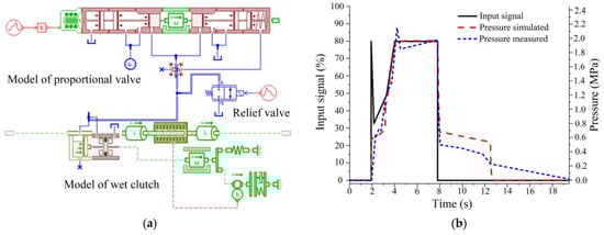 Experimental verification of the simulation model of the shift hydraulic system. (a) Simulation model of shift hydraulic system. (b) Simulation and measurement results of the response of clutch pressure to control signals. Note: the relief valve was designed for rapid pressure relief and was consistent with the actual hydraulic circuit.