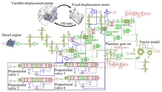 Based on the above equations, a shift dynamics model of the entire continuously variable transmission tractor was constructed using AMESim, as shown in Figure 8.