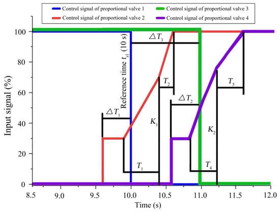 The pressure control signal of the proportional valve based on the direct-shift method is shown in Figure 9. If we define the pressure relief time of proportional valves 1 and 3 as ts1 (i.e., reference time, 10 s), then ΔT is the start time of the pressure rise for proportional valves 2 and 4 relative to ts1. T4 and T2 are the times corresponding to the two inflection points in the pressure rise curve of proportional valve 2, respectively. T1 and T5 are the times corresponding to the two inflection points in the pressure rise curve of proportional valve 4, respectively. K2 and K1 are the percentages of the input signals corresponding to the second inflection point in the pressure rise curve of proportional valves 2 and 4, respectively. The starting time of T1 and T4 is the same, and the starting time and duration of the reverse change in the displacement ratio are Ts and Td, respectively. On this basis, we adopted an orthogonal experiment with nine factors and four levels to optimize the above control parameters. The schedule of the experiment is shown in Table 4, and the results are shown in Table 5 and Table 6. Considering that the peak acceleration directly affects the driving comfort, we only optimized the parameters for this indicator when designing the orthogonal experiments, but we considered other indicators together when analyzing the results.