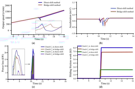 - Compared with the direct-shift method, the bridge-shift method reduces the speed drop by 47.72%, the power loss of clutch C2 by 22.82%, the sliding friction work of clutch C2 by 14.92%, the power loss of clutch C4 by 74.48%, and the sliding friction work of clutch C4 by 75.84%. In addition, the influence of the two control strategies on the peak acceleration can be ignored.