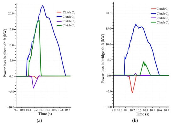 Due to the involvement of multiple clutch actions, the generation of parasitic power is inevitable. To determine the direction of the power flow, we observed the power loss of all the clutches during shifting, as shown in Figure 12a,b. The figure shows that in the direct-shift method, parasitic power mainly flowed back along clutch C3, while in the bridge-shift method, parasitic power mainly flowed back along clutch C1. However, compared to the power flowing in the forward direction in clutches C2 and C4, the parasitic power generated under both shifting strategies was not significant, so the energy loss of clutches C1 and C3 was not discussed in this study.