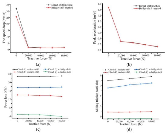 From Figure 13a,b, it can be seen that when the tractive force was less than 20,000 N, the speed drop and peak acceleration both rapidly decreased with the increase in the load. When the tractive force was greater than 20,000 N, the speed drop no longer changed significantly, while the peak acceleration still decreased slightly with the increase in the load. Figure 13c shows that the power loss of clutch C4 decreased with increasing the load, while the variation law of clutch C2 was opposite. However, the above law was very insignificant, especially since the variation in clutch C2 with the load was very small. Figure 13d shows that the sliding friction work of clutch C2 increased with increasing the load, while clutch C4 showed the same law but was not significant.