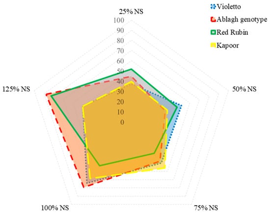 The effects of NS, C, and their interaction (NS × C) showed a significant difference in antioxidant capacity at the 1% level. The highest and lowest antioxidant capacity were observed in the Kapoor cultivar at 100% NS (93.10% DPPH inhibition) and the Red Rubin cultivar at 75% NS (23.30% DPPH inhibition), respectively (Table 4).