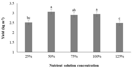 Effect of the different concentrations of Hoagland’s NS on yield. Different letters within each column indicate significant differences according to Duncan’s multiple range test (p = 0.05).