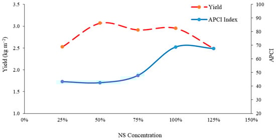 The effects of NS, C, and their interaction (NS × C) on the APCI index differed significantly at the 1% level. The highest and lowest APCI index was measured for the Ablagh genotype at 125% NS concentration (87.81) and 50% NS concentration (34.74), respectively (Table 4 and Figure 1).
