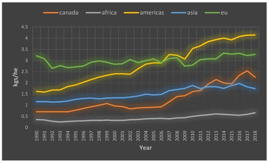 Figure 1 illustrates the evolution of pesticide use per unit of cropland, measured in kilograms per hectare for the time period 1990-2018 in Africa, the EU, Canada, Asia, and the Americas.