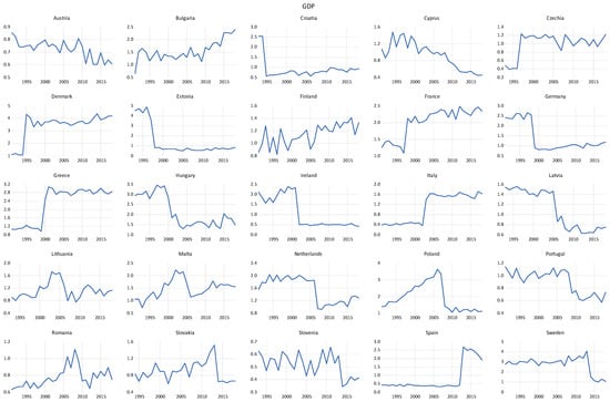 This study employs the annual panel data of twenty-five EU countries (Belgium and Luxemburg are excluded) with a reference period from 1990 to 2018 (1992–2018 for the new-entrant ex-communist countries). Panel data provide more valuable information compared to time-series or cross-sectional data, given that the latter are affected by heterogeneity and cross-section-specific impacts leading to less-reliable and -robust results. What is more, the panel data incorporate more information, more variability, and more efficiency compared to pure time-series data or cross-sectional data. More specifically, panel data can detect and measure statistical effects that pure time-series or cross-sectional data cannot, and when using panel data the results become free from the severe impacts arising from collinearity [55,56,57,58,59].
