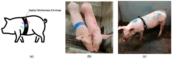 Detailed demonstration of the Zephyr BioHarness belt application on a Topigs Norsvin TN70 piglet. (a) Diagram illustrating the axis orientation. (b) Overhead view portraying the Zephyr BioHarness 3.0 strap’s arrangement around the piglet’s chest, reinforced with a Vetrap bandage. (c) Side perspective showcasing the piglet adorned with the Zephyr BioHarness.