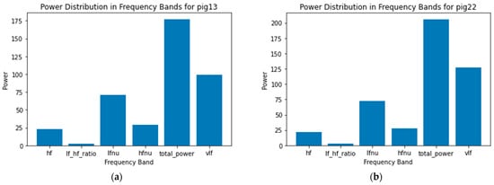 Power distribution in frequency bands for (a) Pig13 and (b) Pig22: insights into autonomic nervous system activity and potential health conditions. The power distribution across frequency bands for the remaining pigs can be found in the Supplementary Information (Supplementary File S3Q1).