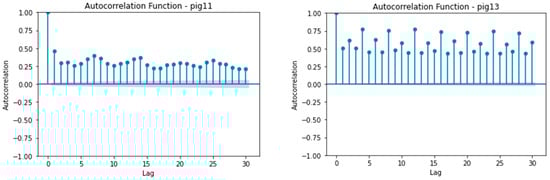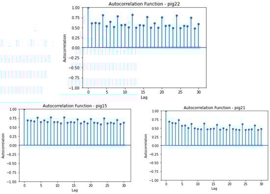 For Pig11, a positive correlation is observed between the ECG amplitude at a given time and its lagged versions (Figure 5). The correlation varies over the lag period, indicating similar patterns observed in ECG amplitude. For Pig13, a stronger positive correlation is observed, indicating remarkably consistent patterns of ECG amplitude over a given period. When analyzing Pigs 15, 21, and 22, a positive correlation is observed for all, indicating similar patterns of ECG amplitude at a given time. Pig15 exhibits a stronger positive correlation than Pigs 21 and 22. For Pig22, the correlation varies more over the lagged versions, indicating greater fluctuation in ECG amplitude.