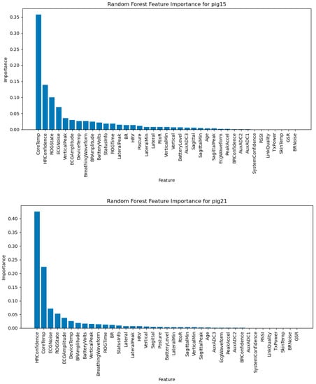 Stress in pigs can be evaluated by detecting physiological changes such as those recorded by the 3-in-1 sensor and alterations in behaviors inferred from accelerometer data. Some potential stress indicators include heart rate (HR), heart rate variability (HRV), breathing rate (BR), and changes in activity and posture [25,26,27,28]. Furthermore, parameters such as ECG amplitude, ECG noise, and galvanic skin response (GSR) can also signify increased stress levels. However, it’s important to acknowledge that these changes need to be substantial and sustained to reliably attribute to stress, as short-term fluctuations can occur for various reasons.