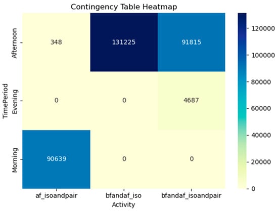 Figure 20 shows a contingency heatmap that visualizes the distribution of different pig activity states—‘af_isoandpair’, ‘bfandaf_iso’, and ‘bfandaf_isoandpair’, across various time periods: morning, afternoon, and evening. The x-axis delineates the activity states, and the y-axis represents the respective time periods.