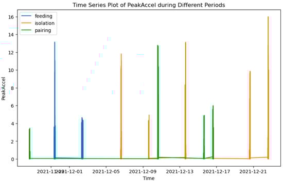 Temporal dynamics of peak acceleration: comparative analysis across feeding, isolation, and pairing periods.