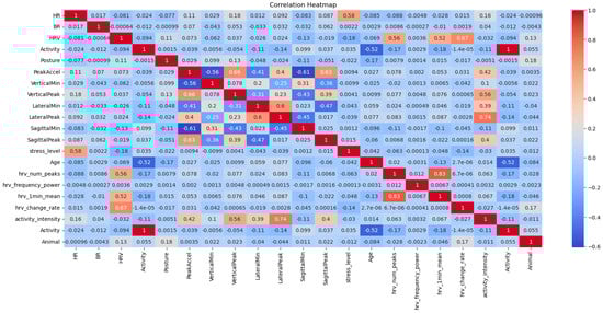Figure 23 provides a comprehensive correlation heatmap, portraying the interrelationships among physiological parameters like heart rate and breathing rate, accelerometer-based measurements, postural dynamics, activity levels, and stress indicators across the study’s pig population. This heatmap aids in discerning potential patterns and associations that might have crucial implications for understanding the overall welfare of the pigs. Particularly noteworthy are the associations between stress levels, activity intensity, and the quality of gait as depicted through postural metrics. Each correlation color-codes the strength and direction of the relationship between two variables, thereby offering a high-level view of the interconnectedness within our dataset. By scrutinizing this map, researchers can identify key variables of interest that appear to be closely tied to the welfare indicators of interest, forming the basis for more focused, hypothesis-driven analyses.