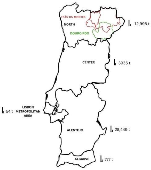 Geographical location of the main regions for almond production (NUTSII). Since no values exist for the “Madeira” and “Azores” islands, they were not included in the figure. The “Amêndoa do Douro” Protected Designation of Origin (PDO) is also evidenced. Numerical data included refer to the production (t) obtained in 2022, according to the information available at Instituto Nacional de Estatística [35].